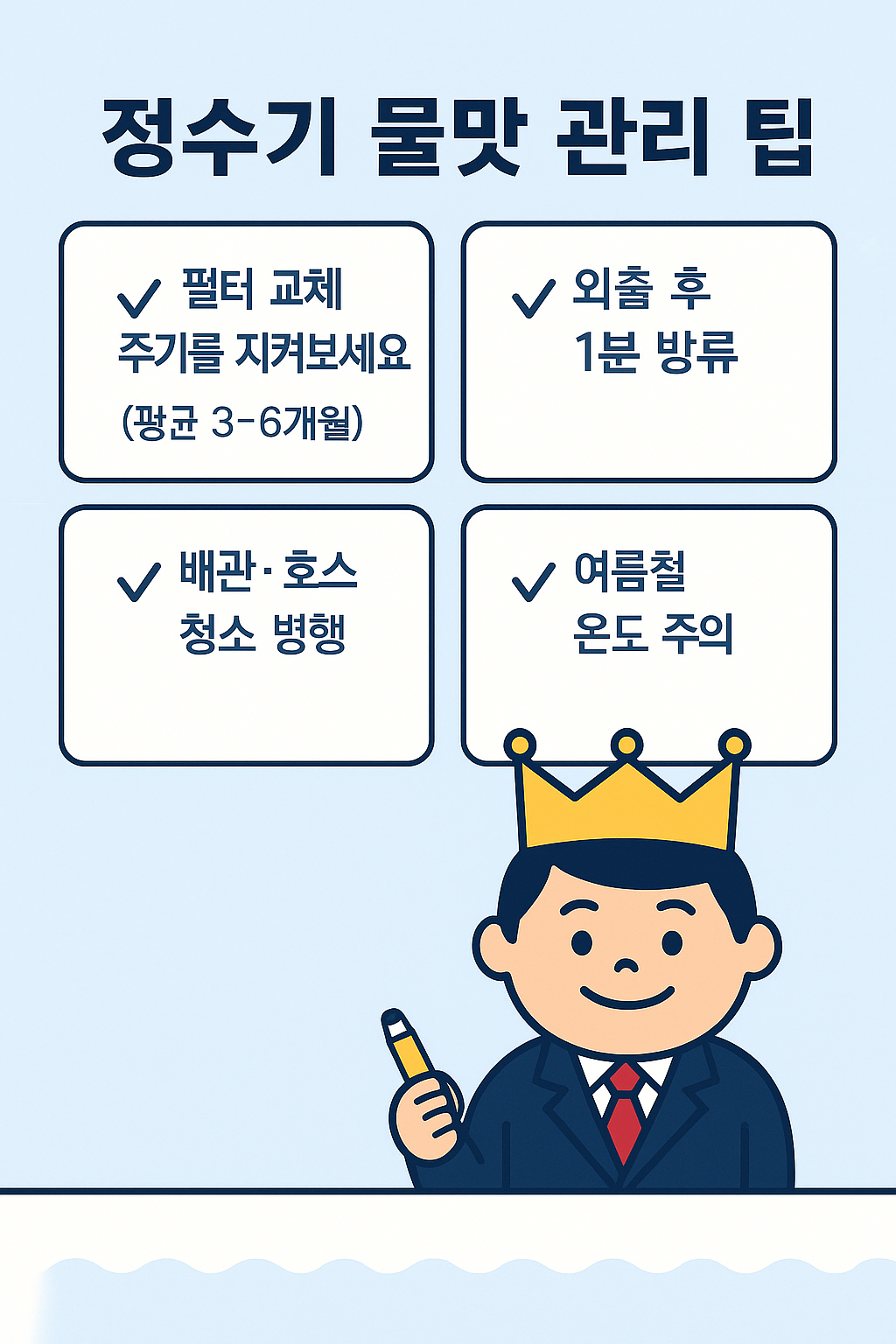 4️⃣ 여름철에는 정수기 주변 온도·습도도 관리하세요.